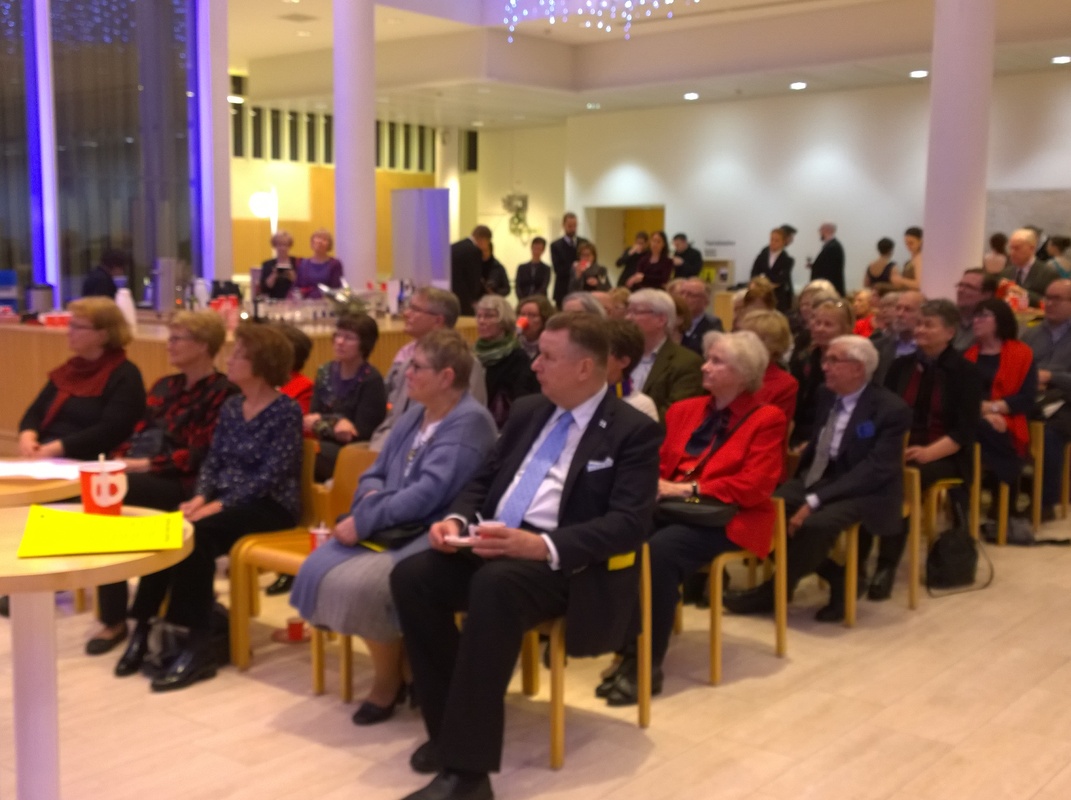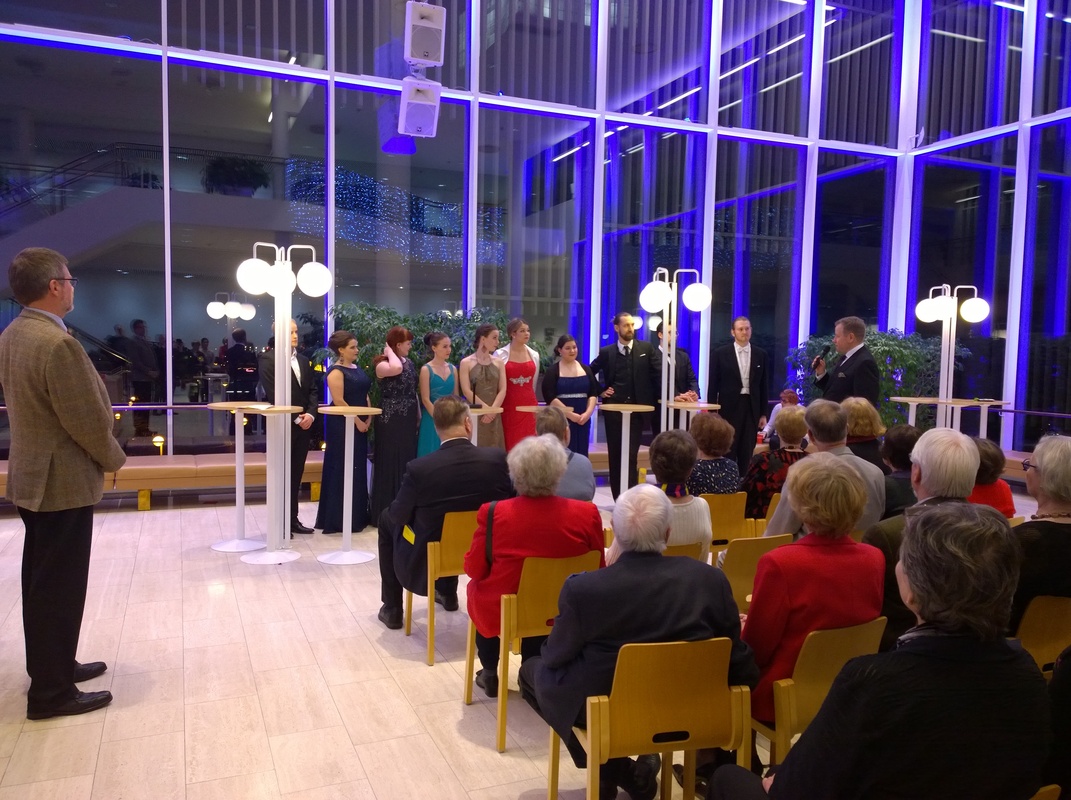 Suomalaisen oopperaillan, 15.12.2017, jälkeinen Taiteilijatapaaminen yhdistettynä Soitinhuoltorahaston stipendien jakoon ja Ystävien glögeihin veti lämpiöön noin sadan hengen yleisön.